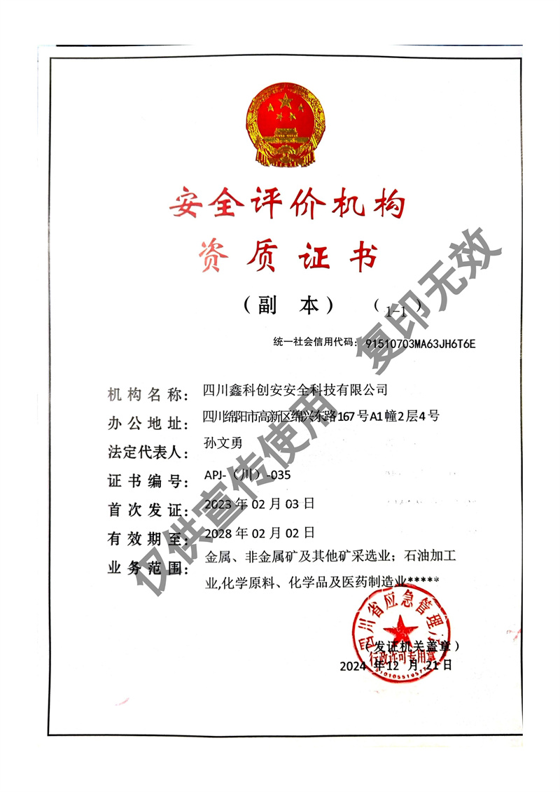 四川鑫科創(chuàng)安安全科技有限公司成立于2020年,是川北地區(qū)取得資質的民營安全評價機構(資質證書編號:APJ-(川)-035)。并于2022年牽頭成立綜合應急救援隊伍 - 綿陽曙光應急救援中心。